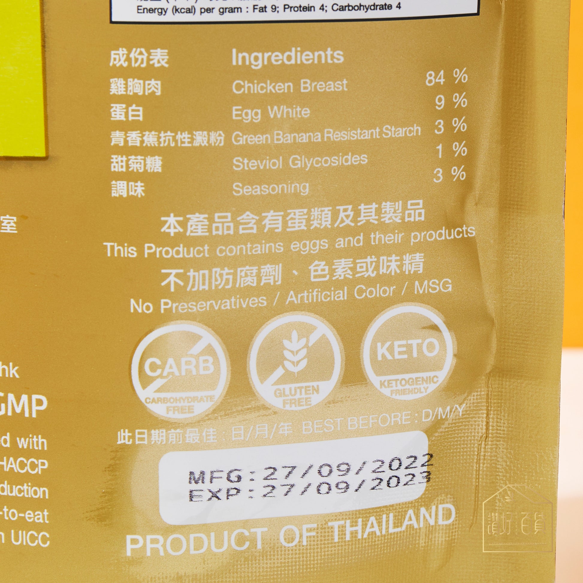 成分:雞胸84%、蛋白9%、*青香蕉抗性澱粉 3%*、甜菊糖 1%、調味 3%