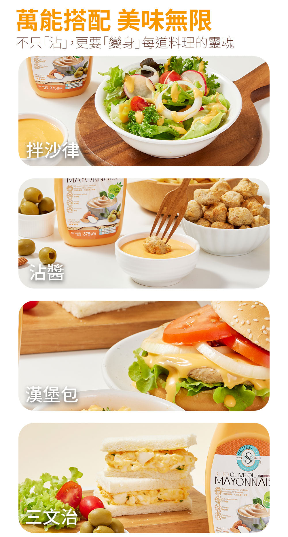 用法多元:沙律醬、漢堡包/三文治醬汁、炒飯、Pizza醬、配炸薯條/炸雞/氣炸鍋炸物、烹調涼拌、各式沾醬、熱狗醬